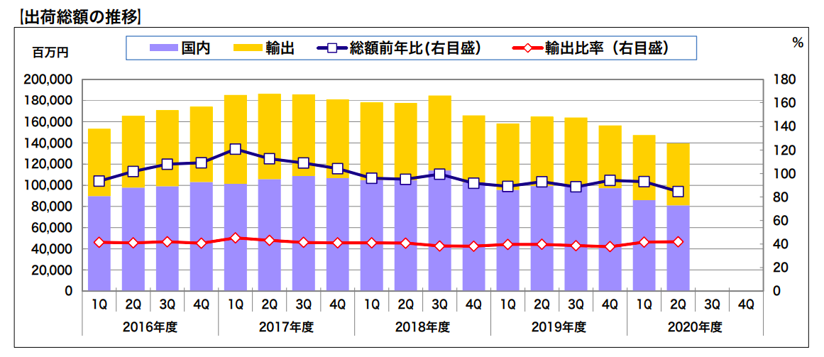 国内出荷額は810億7000万円で、前年同期比は81.6%と7期連続で100%を割った。