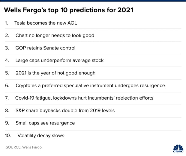 Following its relentless rally in the late 1990s, AOL, like many causalities of the dot-com bubble, failed to keep up with the times, which is a risk that Tesla, up almost 700% this year, also faces in the coming year, he explained. “After ’99, many tech and growth companies lost 50% to 100% [of value],” Harvey said. “We’re thinking in 2020, everything happens much faster. So, if it took 12 months for the end to begin, now it’s going to take six months.”
